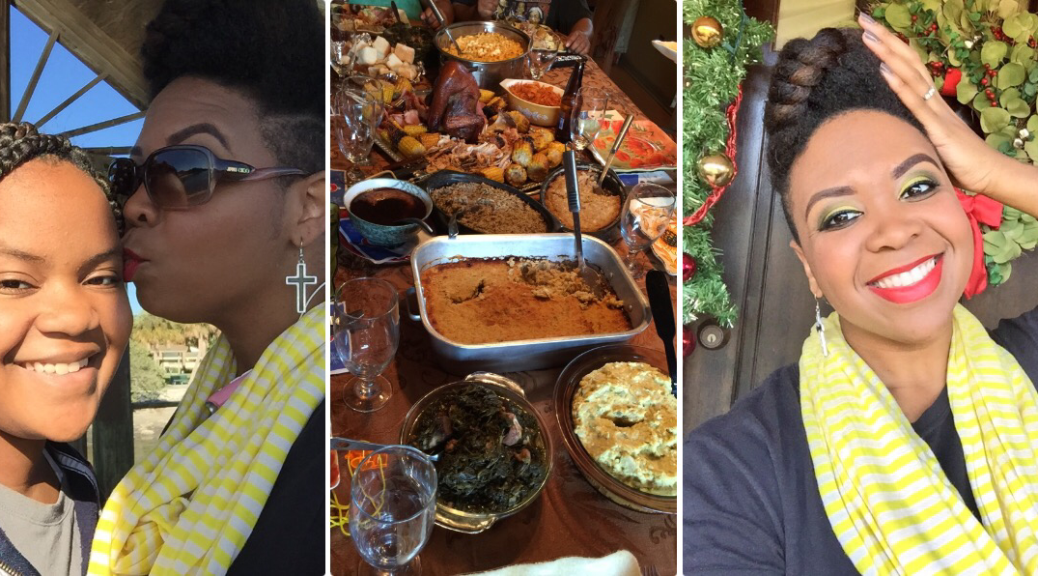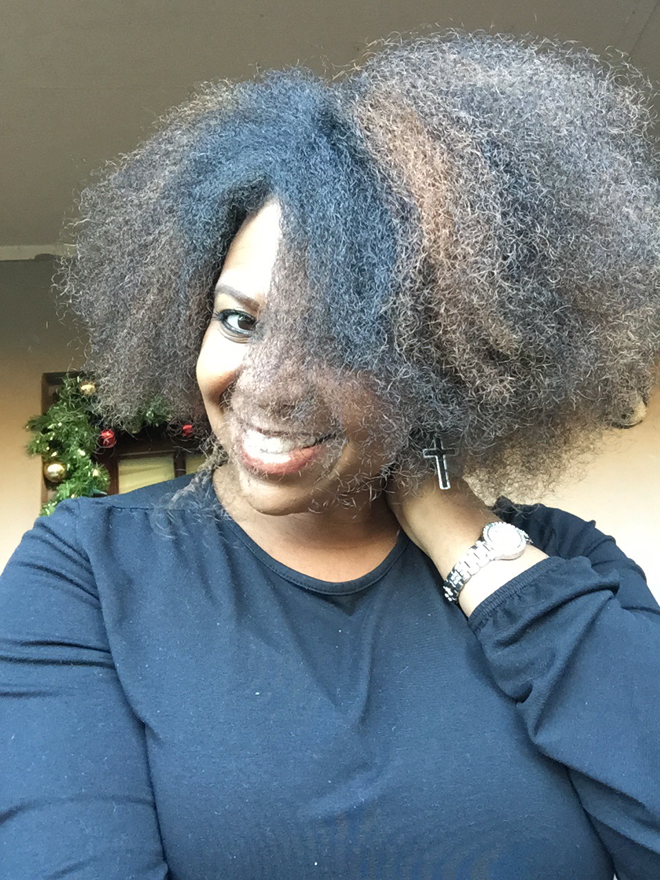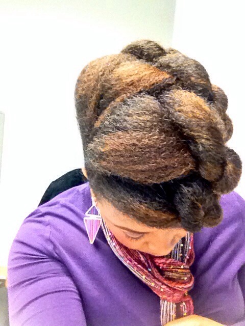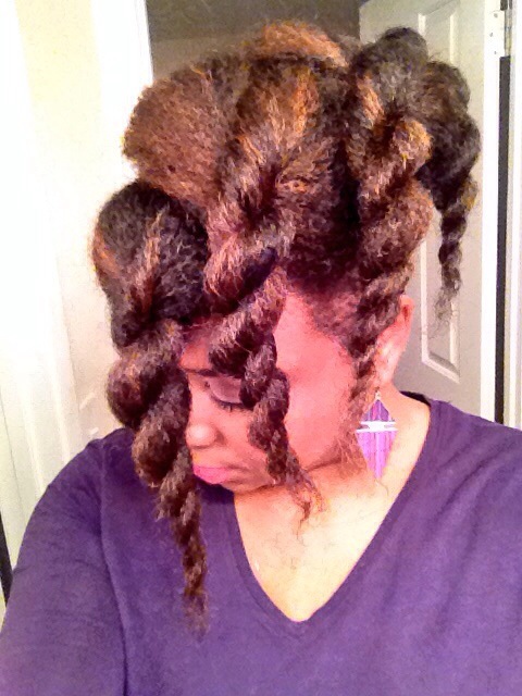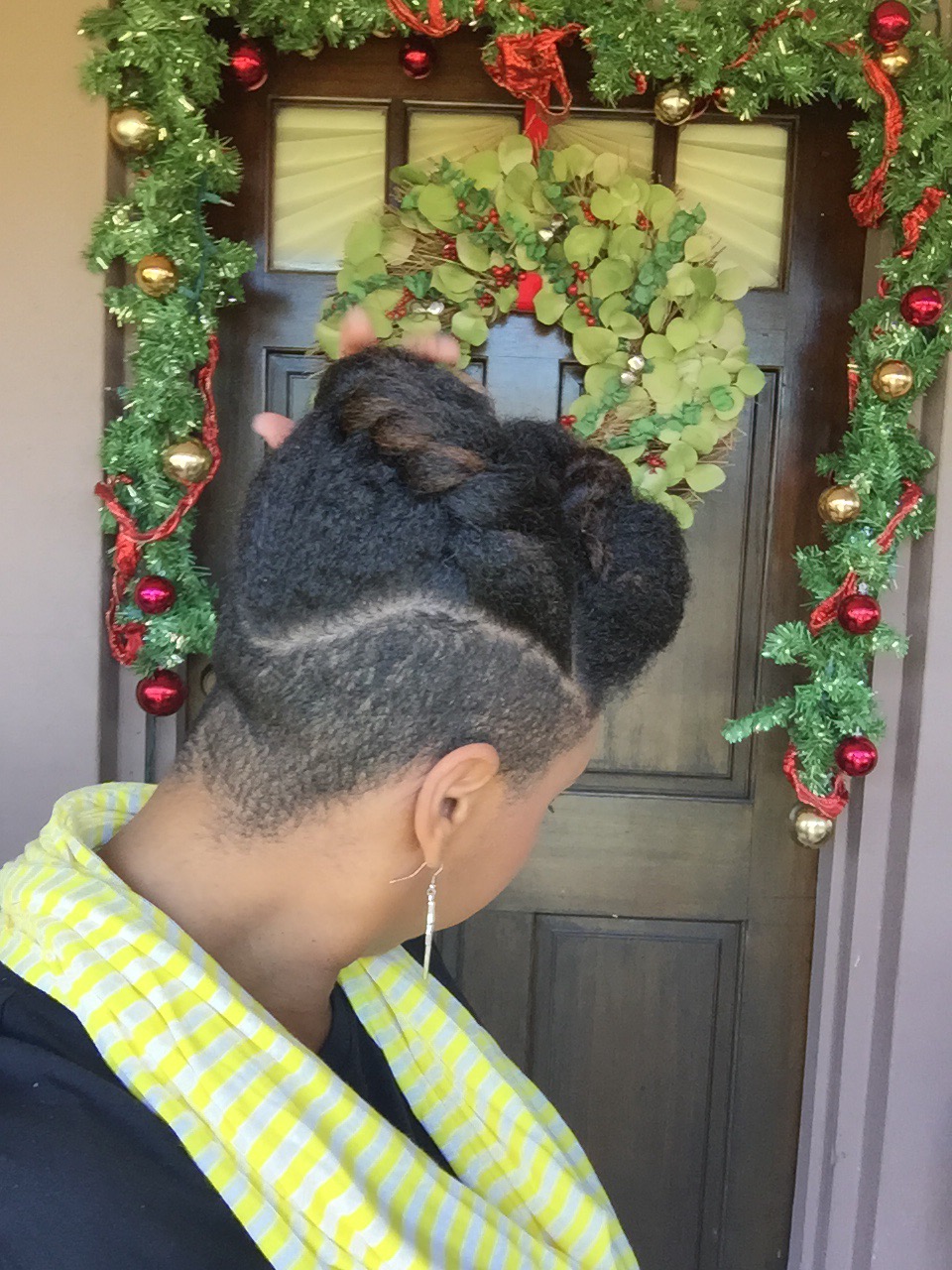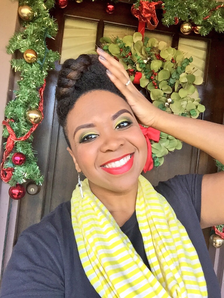 Using my in-laws Christmas decorated front porch as a back drop for pics, the holiday hair was a mixed bag of twist styles and fros! Thanksgiving eve I went with this high twisted bun.