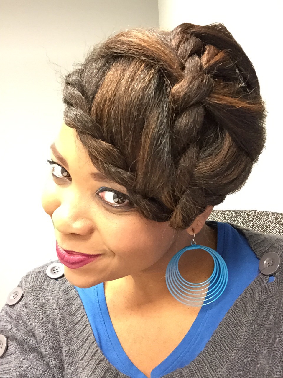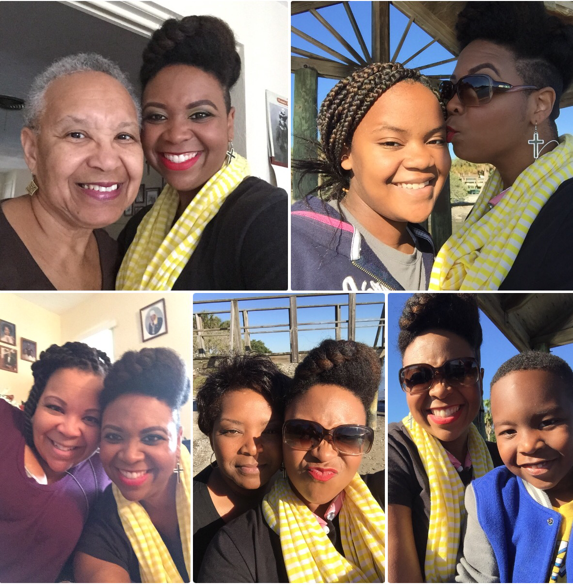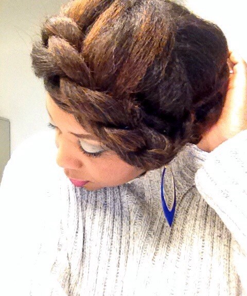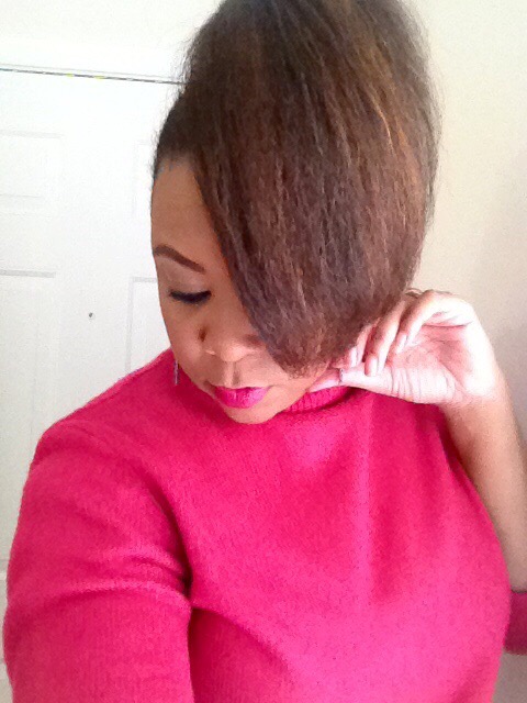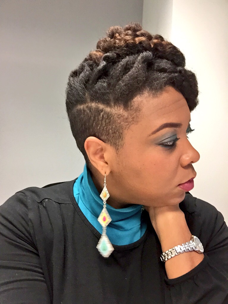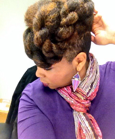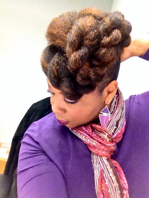 Using my in-laws Christmas decorated front porch as a back drop for pics, the holiday hair was a mixed bag of twist styles and fros! Thanksgiving eve I went with this high twisted bun.
