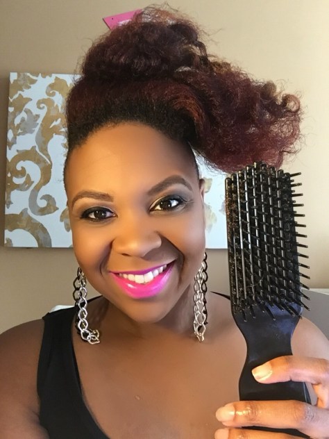 In the morning when I’m ready to style my hair, I untwist my hair and take down the ponytail. My roots are now nice and stretched. I use my Detangler brush to further smooth out and disrupt any curl patterns.